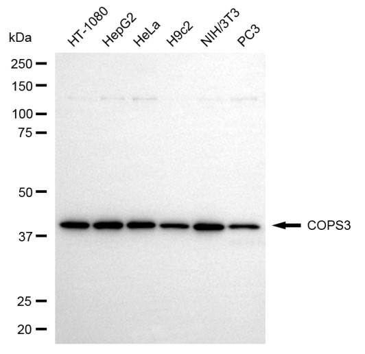 Western blotting analysis using COPS3 antibody. Total cell lysates (30 μg) from various cell lines were loaded and separated by SDS-PAGE. The blot was incubated with COPS3 antibody and HRP-conjugated goat anti-rabbit secondary antibody respectively.