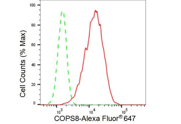 Flow cytometric analysis of COPS8 expression in HepG2 cells using COPS8 antibody. Green, isotype control; red, COPS8.