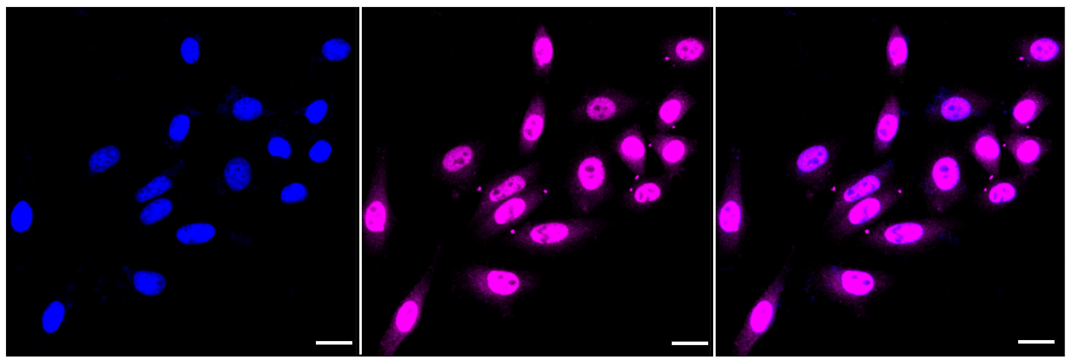 Immunocytochemical staining of HepG2 cells with COPS8 antibody. Nuclei were stained blue with DAPI; COPS8 was stained magenta with Alexa Fluor? 647. Images were taken using Leica stellaris 5. Protein abundance based on laser Intensity and smart gain: High. Scale bar: 20 μm.