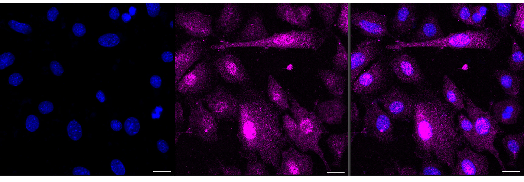 Immunocytochemical staining of C2C12 cells with CRABP2 antibody. Nuclei were stained blue with DAPI; CRABP2 was stained magenta with Alexa Fluor? 647. Images were taken using Leica stellaris 5. Protein abundance based on laser Intensity and Smart Gain: Medium. Scale bar, 20 μm.