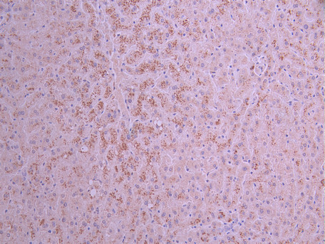 IHC image of CSB-RA005991MA1HU diluted at 1:50 and staining in paraffin-embedded human liver tissue performed on a Leica BondTM system. After dewaxing and hydration, antigen retrieval was mediated by high pressure in a citrate buffer (pH 6.0). Section was blocked with 10% normal goat serum 30min at RT. Then primary antibody (1% BSA) was incubated at 4°C overnight. The primary is detected by a Anti-Human lgG, Fcy Fragment Specific labeled by HRP and visualized using 0.05% DAB.