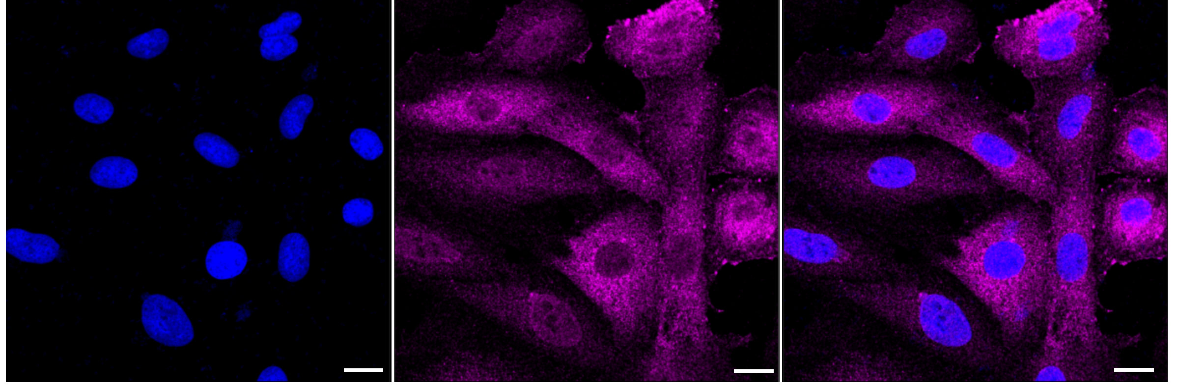 Immunocytochemical staining of HT-1080 cells with Crystallin alpha B antibody. Nuclei were stained blue with DAPI; Crystallin alpha B was stained magenta with Alexa Fluor? 647. Images were taken using Leica stellaris 5. Protein abundance based on laser Intensity and smart gain: Medium. Scale bar: 20 μm.