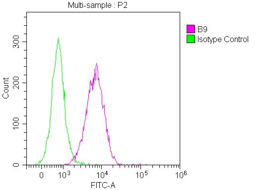 Overlay Peak curve showing Jurkat cells stained with CSB-RA002831A0HU (red line) with 1 μg/well (10 μg/mL, 100 μL/well). Then 10% normal goat serum was Incubated to block non-specific protein-protein interactions followed by the antibody (1μg/1*106cells) for 45 min at 4°C. The secondary antibody used was FITC-conjugated Goat Anti-Mouse IgG(H+L) at 1/200 dilution for 35 min at 4°C. Isotype control antibody (green line) was mouse IgG1 (1μg/1*106cells) used under the same conditions.Acquisition of >10,000 events was performed.