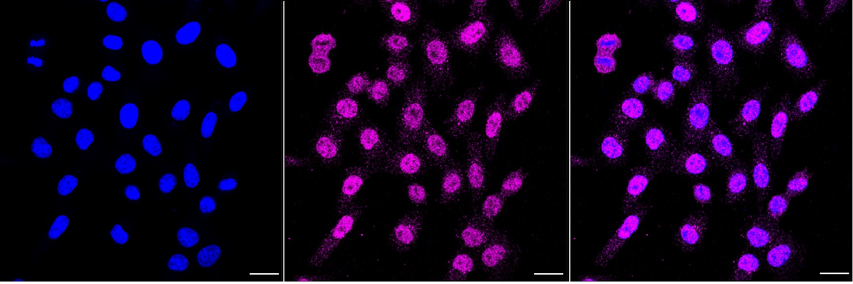 Immunocytochemical staining of HepG2 cells with Casein kinase 2 beta antibody. Nuclei were stained blue with DAPI; Casein kinase 2 beta was stained magenta with Alexa Fluor? 647. Images were taken using Leica stellaris 5. Protein abundance based on laser Intensity and smart gain: Medium. Scale bar, 20 μm.