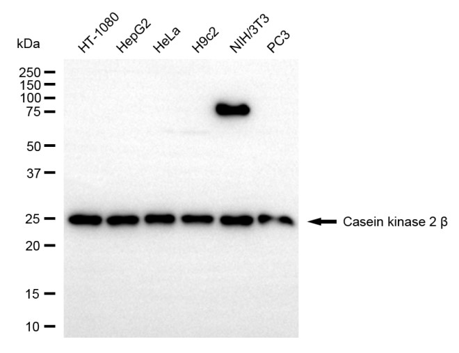 Western blotting analysis using casein kinase 2 beta antibody. Total cell lysates (30 μg) from various cell lines were loaded and separated by SDS-PAGE. The blot was incubated with casein kinase 2 beta antibody and HRP-conjugated goat anti-rabbit secondary antibody respectively.
