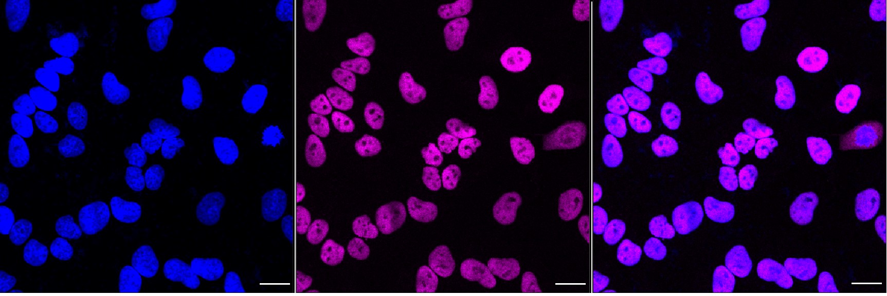 Immunocytochemical staining of HeLa cells with C-terminal binding protein 2 antibody. Nuclei were stained blue with DAPI; C-terminal binding protein 2 was stained magenta with Alexa Fluor? 647. Images were taken using Leica stellaris 5. Protein abundance based on laser Intensity and smart gain: Medium. Scale bar, 20 μm.