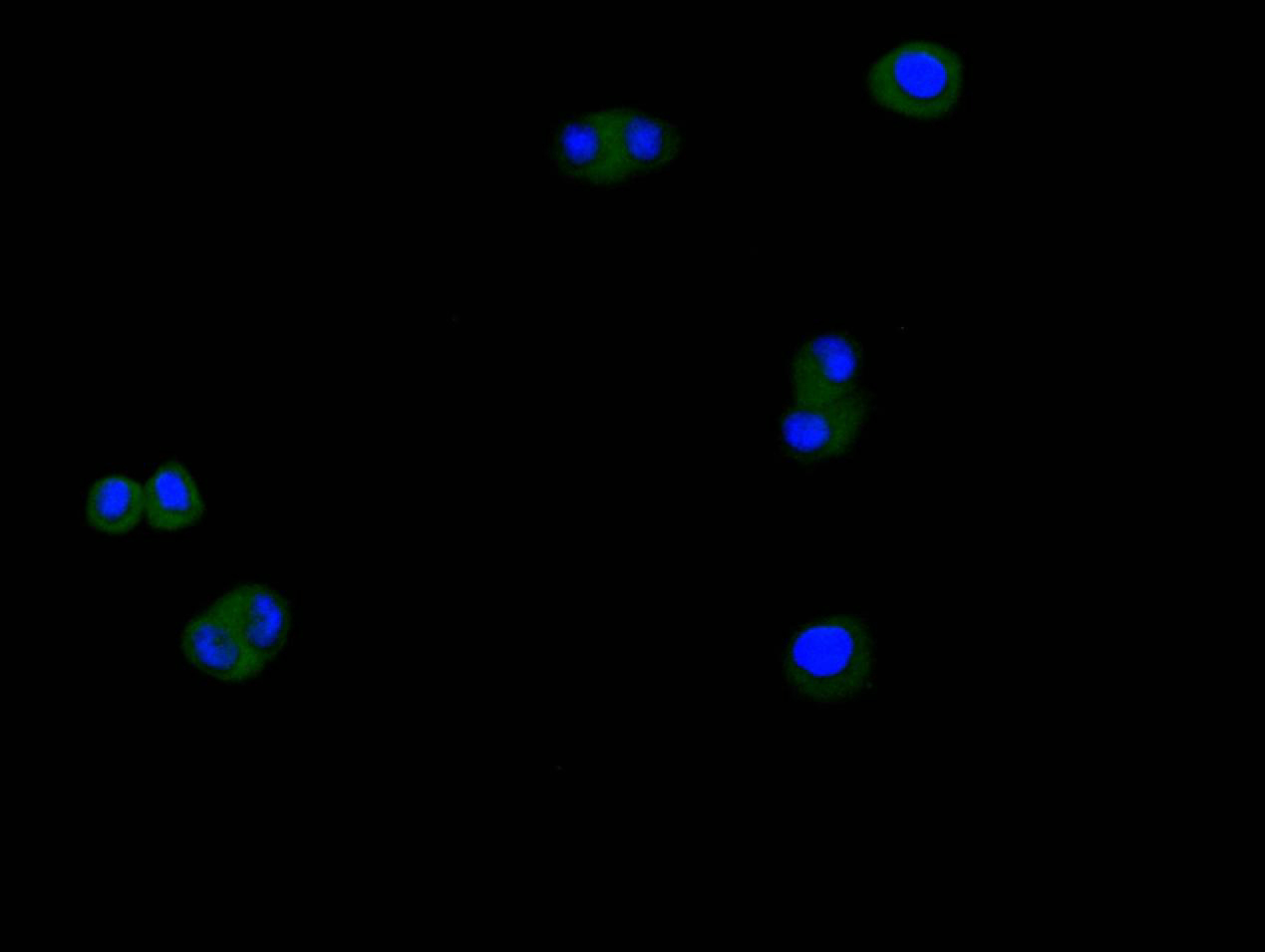Immunofluorescence staining of Hela cell with CSB-RA006169MA1HU at 1:200, counter-stained with DAPI. The cells were fixed in 4% formaldehyde and blocked in 10% normal Goat Serum. The cells were then incubated with the antibody overnight at 4C. The secondary antibody was Alexa Fluor 488-congugated AffiniPure Goat Anti-rabbit IgG(H+L).