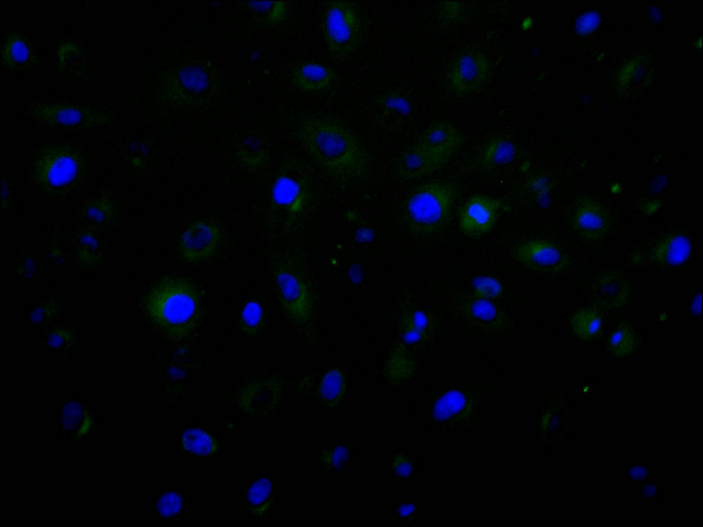 Immunofluorescence staining of A549 cell with CSB-RA268308A0HU at 1:50, counter-stained with DAPI. The cells were fixed in 4% formaldehyde and blocked in 10% normal Goat Serum. The cells were then incubated with the antibody overnight at 4°C. The secondary antibody was Alexa Fluor 488-congugated AffiniPure Goat Anti-Rabbit IgG(H+L).
