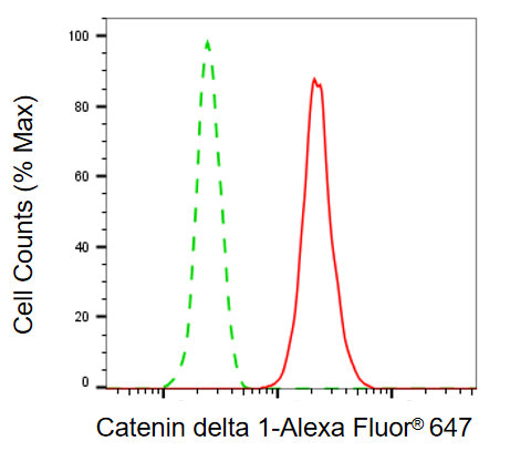 Flow cytometric analysis of catenin delta 1 expression in C2C12 cells using catenin delta 1 antibody. Green, isotype control; red, catenin delta 1.