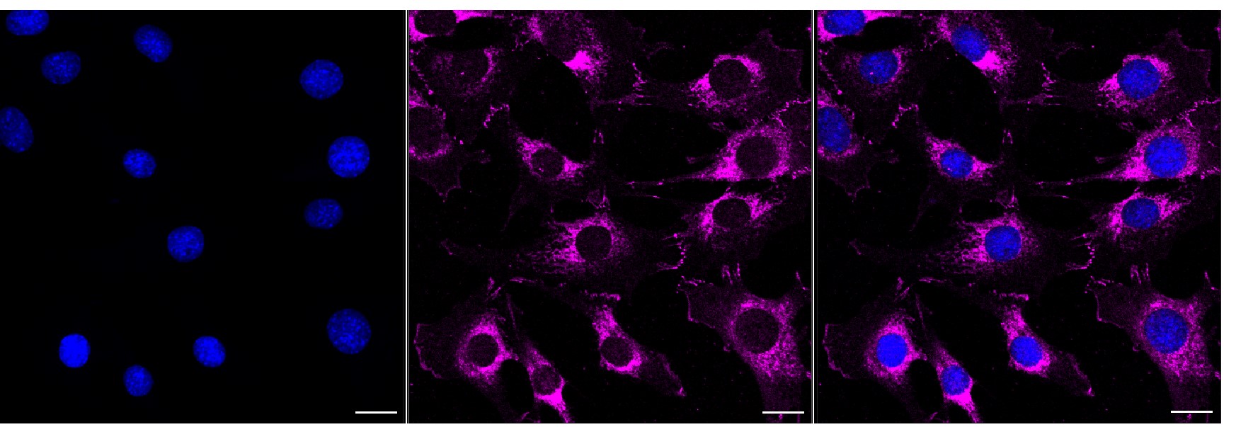 Immunocytochemical staining of C2C12 cells with Catenin delta 1? antibody. Nuclei were stained blue with DAPI; Catenin delta 1? was stained magenta with Alexa Fluor? 647. Images were taken using Leica stellaris 5. Protein abundance based on laser Intensity and smart gain: Medium. Scale bar, 20 μm.