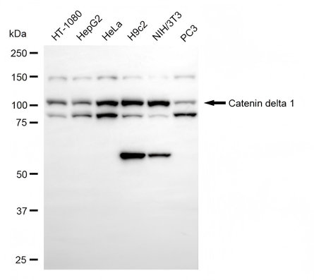 Western blotting analysis using catenin delta 1 antibody. Total cell lysates (30 μg) from various cell lines were loaded and separated by SDS-PAGE. The blot was incubated with catenin delta 1 antibody and HRP-conjugated goat anti-rabbit secondary antibody respectively.