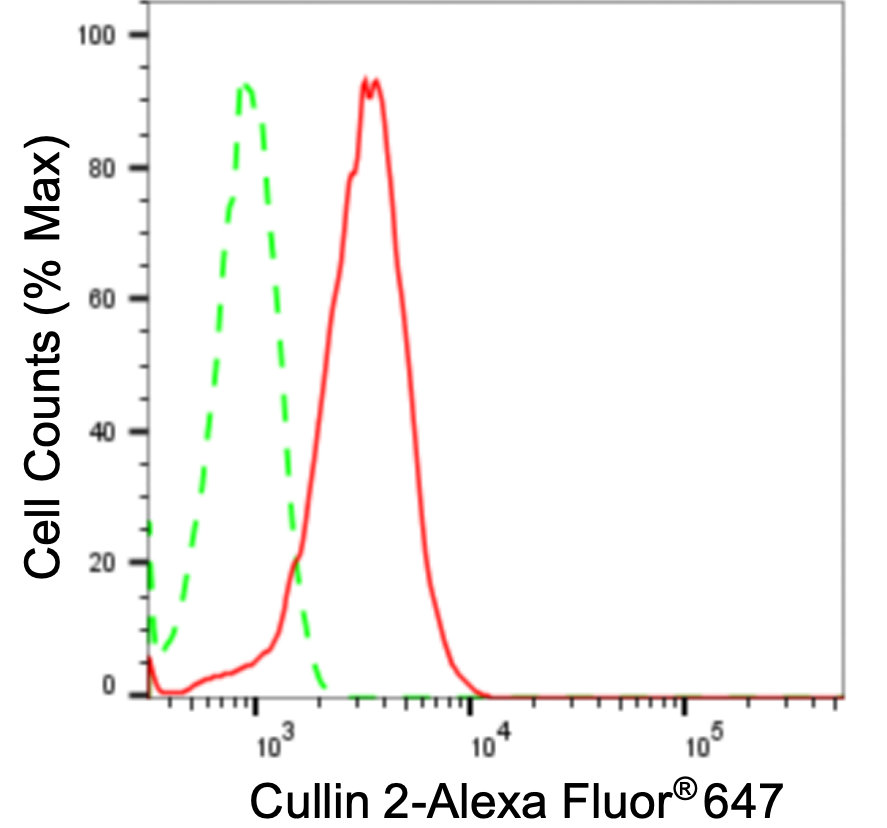 Flow cytometric analysis of Cullin 2 expression in HepG2 cells using Cullin 2 antibody. Green, isotype control; red, Cullin 2.