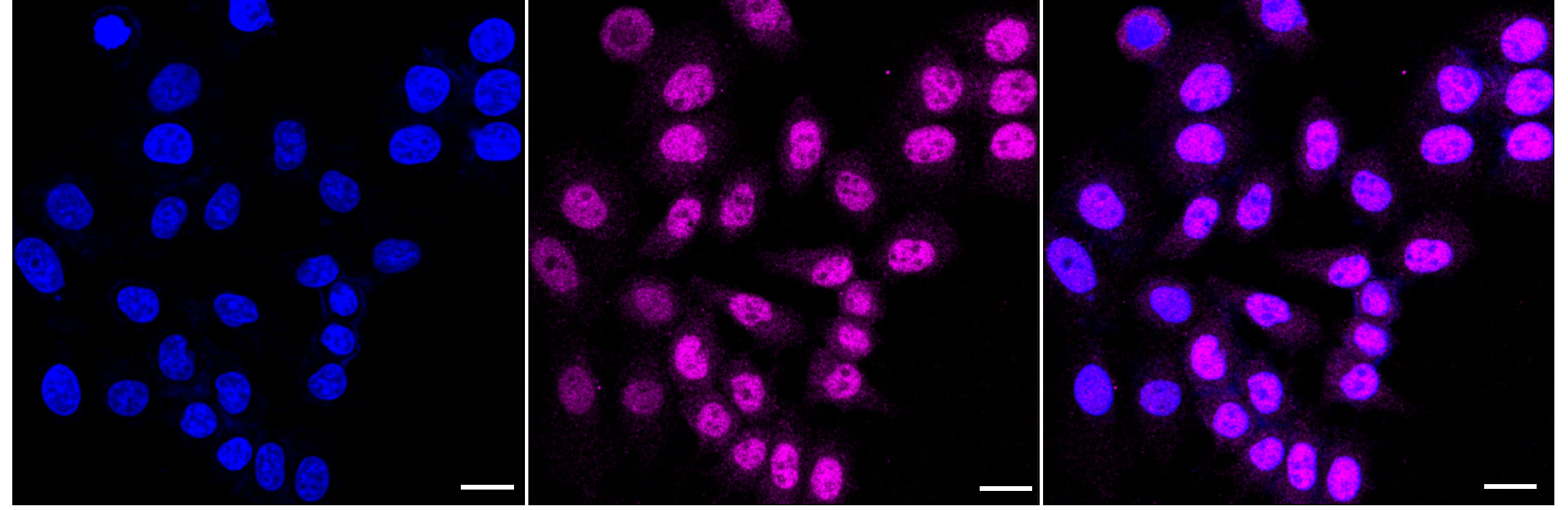 Immunocytochemical staining of HepG2 cells with cullin 2 antibody. Nuclei were stained blue with DAPI; Cullin 2 was stained magenta with Alexa Fluor? 647. Images were taken using Leica stellaris 5. Protein abundance based on laser Intensity and smart gain: Medium. Scale bar: 20 μm.