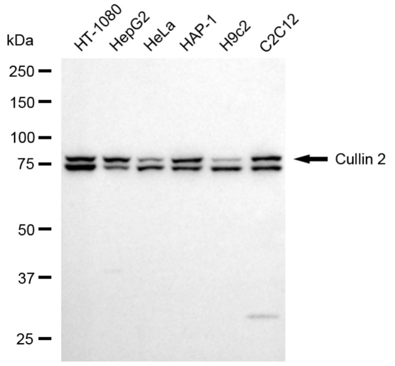 Western blotting analysis using Cullin 2 antibody. Total cell lysates (20 μg) from various cell lines were loaded and separated by SDS-PAGE. The blot was incubated with Cullin 2 antibody and HRP-conjugated goat anti-rabbit secondary antibody respectively.