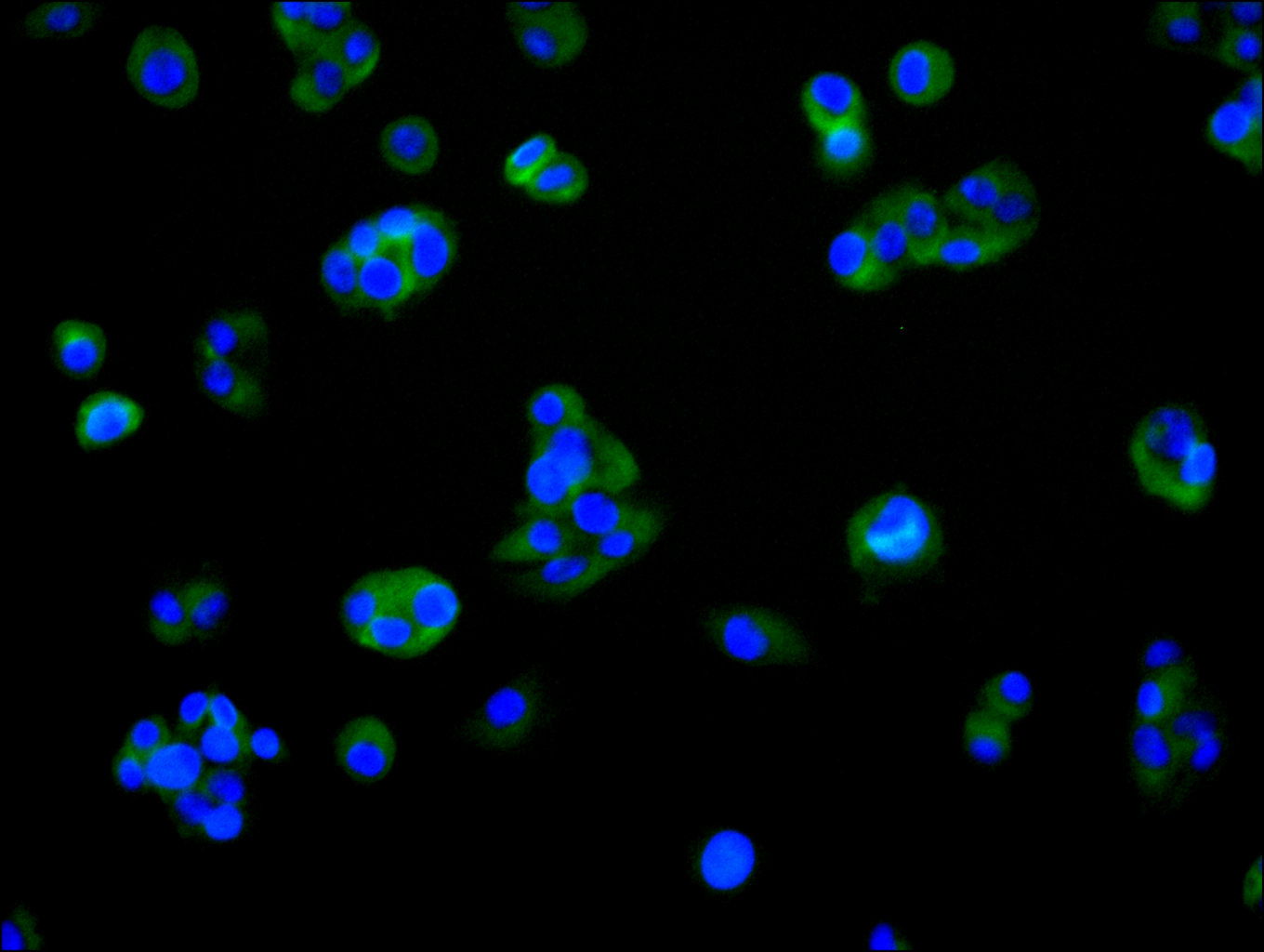 Immunofluorescence staining of HepG2 cell with CSB-RA006255MA1HU at 1:30 ,counter-stained with DAPI. The cells were fixed in 4% formaldehyde and blocked in 10% normal Goat Serum. The cells were then incubated with the antibody overnight at 4°C. The secondary antibody was Fluorescein (FITC) AffiniPure Goat Anti-Human IgG, Fcγ fragment specific.