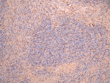 IHC image of CSB-RA006255MA1HU diluted at 1:50 and staining in paraffin-embedded human lymph node tissue performed on a Leica BondTM system. After dewaxing and hydration, antigen retrieval was mediated by high pressure in a citrate buffer (pH 6.0). Section was blocked with 10% normal goat serum 30min at RT. Then primary antibody (1% BSA) was incubated at 4°C overnight. The primary is detected by a Anti-Human lgG, Fcy Fragment Specific labeled by HRP and visualized using 0.05% DAB.