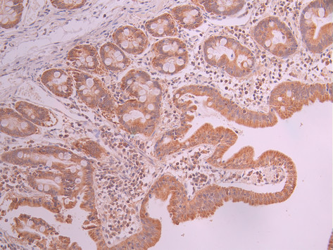 IHC image of CSB-RA194672A0HU diluted at 1:100 and staining in paraffin-embedded human small intestine tissue performed on a Leica BondTM system. After dewaxing and hydration, antigen retrieval was mediated by high pressure in a citrate buffer (pH 6.0). Section was blocked with 10% normal goat serum 30min at RT. Then primary antibody (1% BSA) was incubated at 4°C overnight. The primary is detected by a Goat anti-rabbit polymer IgG labeled by HRP and visualized using 0.05% DAB.