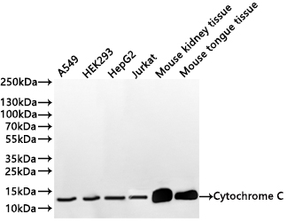 Positive WB detected in: A549 whole cell lysate(30μg), HEK293 whole cell lysate(30μg), HepG2 whole cell lysate(30μg), Jurkat whole cell lysate(30μg), Mouse kidney tissue lysate(30μg), Mouse tongue tissue lysate(30μg)