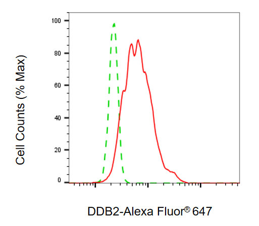 Flow cytometric analysis of DDB2 expression in HT-1080 cells using DDB2 antibody. Green, isotype control; red, DDB2.