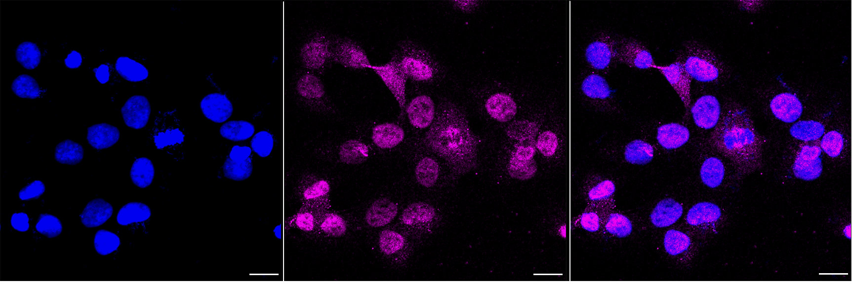 Immunocytochemical staining of HT-1080 cells with DDB2 antibody. Nuclei were stained blue with DAPI; DDB2 was stained magenta with Alexa Fluor? 647. Images were taken using Leica stellaris 5. Protein abundance based on laser Intensity and smart gain: Medium. Scale bar, 20 μm.