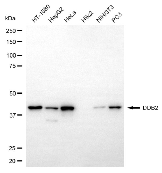 Western blotting analysis using DDB2 antibody. Total cell lysates (30 μg) from various cell lines were loaded and separated by SDS-PAGE. The blot was incubated with DDB2 antibody and HRP-conjugated goat anti-rabbit secondary antibody respectively.