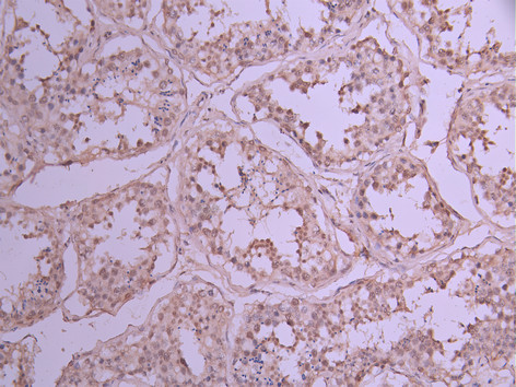 IHC image of CSB-RA209536A0HU diluted at 1:100 and staining in paraffin-embedded human testis tissue performed on a Leica BondTM system. After dewaxing and hydration, antigen retrieval was mediated by high pressure in a citrate buffer (pH 6.0). Section was blocked with 10% normal goat serum 30min at RT. Then primary antibody (1% BSA) was incubated at 4°C overnight. The primary is detected by a Goat anti-rabbit polymer IgG labeled by HRP and visualized using 0.05% DAB.