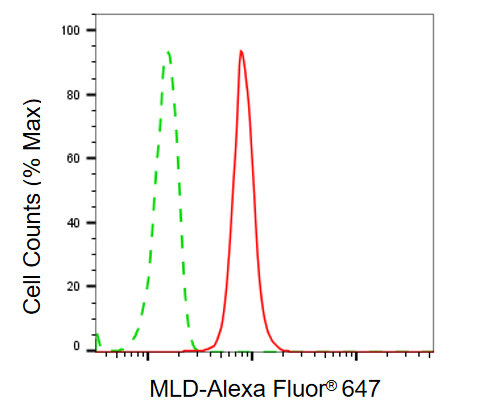 Flow cytometric analysis of MLD expression in HT-1080 cells using MLD antibody. Green, isotype control; red, MLD.