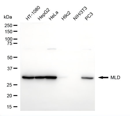 Western blotting analysis using MLD antibody. Total cell lysates (30 μg) from various cell lines were loaded and separated by SDS-PAGE. The blot was incubated with MLD antibody and HRP-conjugated goat anti-rabbit secondary antibody respectively.