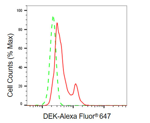 Flow cytometric analysis of DEK expression in HeLa cells using DEK antibody. Green, isotype control; red, DEK.