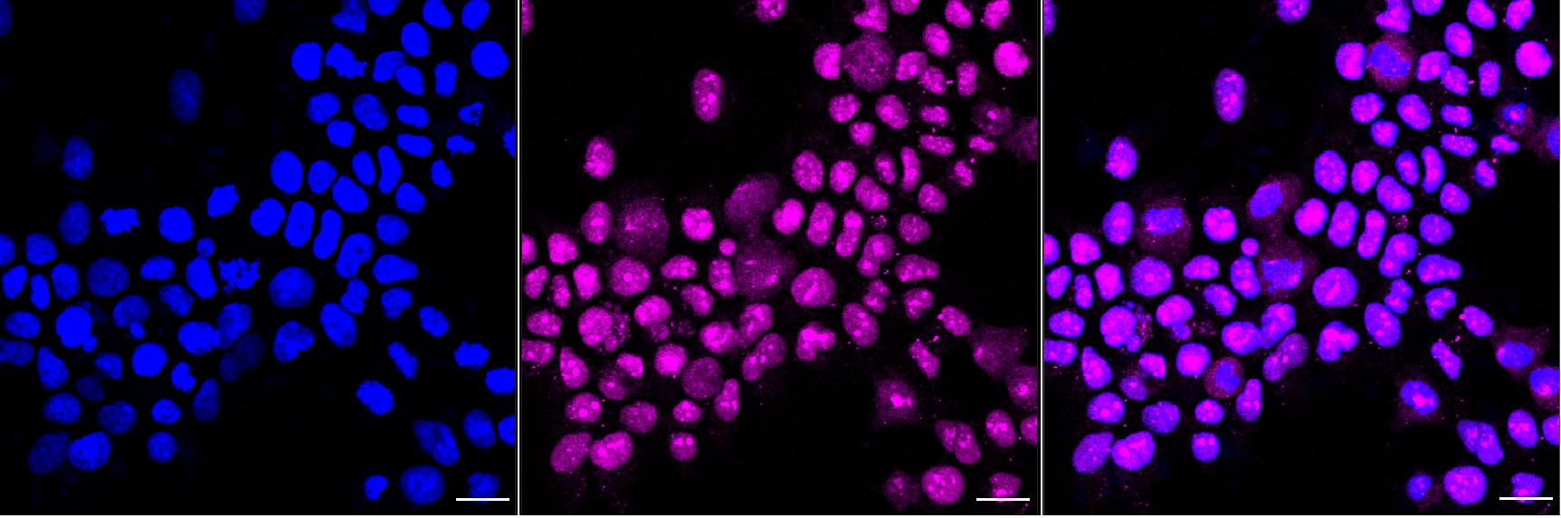 Immunocytochemical staining of Hela cells with DEK antibody. Nuclei were stained blue with DAPI; DEK was stained magenta with Alexa Fluor? 647. Images were taken using Leica stellaris 5. Protein abundance based on laser Intensity and smart gain: High. Scale bar, 20 μm.