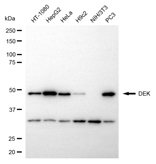 Western blotting analysis using DEK antibody. Total cell lysates (30 μg) from various cell lines were loaded and separated by SDS-PAGE. The blot was incubated with DEK antibody and HRP-conjugated goat anti-rabbit secondary antibody respectively.