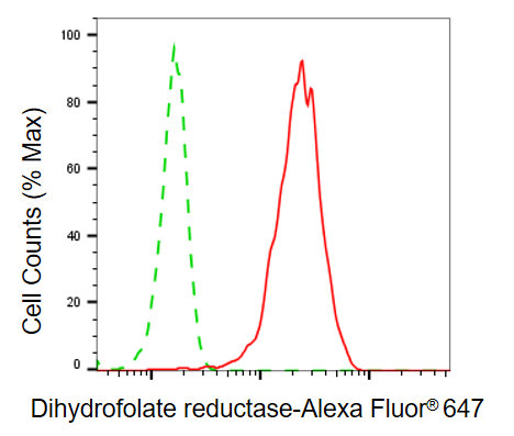 Flow cytometric analysis of dihydrofolate reductase expression in HeLa cells using dihydrofolate reductase antibody. Green, isotype control; red, dihydrofolate reductase.