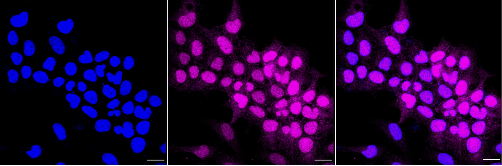 Immunocytochemical staining of Hela cells with Dihydrofolate reductase antibody. Nuclei were stained blue with DAPI; Dihydrofolate reductase was stained magenta with Alexa Fluor? 647. Images were taken using Leica stellaris 5. Protein abundance based on laser Intensity and smart gain: Medium. Scale bar, 20 μm.