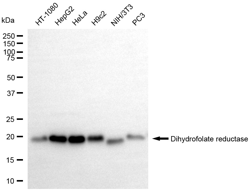 Western blotting analysis using dihydrofolate reductase antibody. Total cell lysates (30 μg) from various cell lines were loaded and separated by SDS-PAGE. The blot was incubated with dihydrofolate reductase antibody and HRP-conjugated goat anti-rabbit secondary antibody respectively.