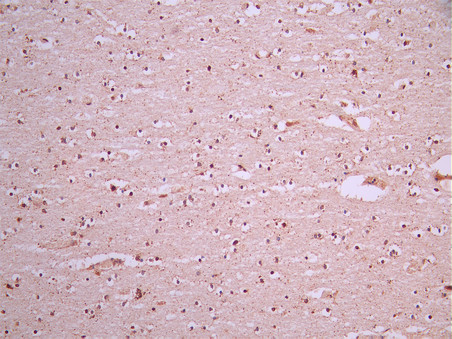 IHC image of CSB-RA196900A0HU diluted at 1:100 and staining in paraffin-embedded human brain tissue performed on a Leica BondTM system. After dewaxing and hydration, antigen retrieval was mediated by high pressure in a citrate buffer (pH 6.0). Section was blocked with 10% normal goat serum 30min at RT. Then primary antibody (1% BSA) was incubated at 4°C overnight. The primary is detected by a Goat anti-rabbit polymer IgG labeled by HRP and visualized using 0.05% DAB.
