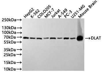 別名:70 kDa mitochondrial autoantigen of primary biliary cirrhosis antibody; Dihydrolipoamide acetyltransferase component of pyruvate dehydrogenase complex antibody; Dihydrolipoamide S Acetyltransferase antibody; Dihydrolipoyllysine-residue acetyltransferase component of pyruvate dehydrogenase complex antibody; dihydrolipoyllysine-residue acetyltransferase component of pyruvate dehydrogenase complex mitochondrial antibody; DLAT antibody; DLTA antibody; E2 antibody; E2 component of pyruvate dehydrogenase complex antibody; M2 antigen complex 70 kDa subunit antibody; mitochondrial antibody; ODP2_HUMAN antibody; PBC antibody; PDC E2 antibody; PDC-E2 antibody; PDCE2 antibody; Pyruvate dehydrogenase complex component E2 antibody; Pyruvate dehydrogenase complex E2 subunit antibody