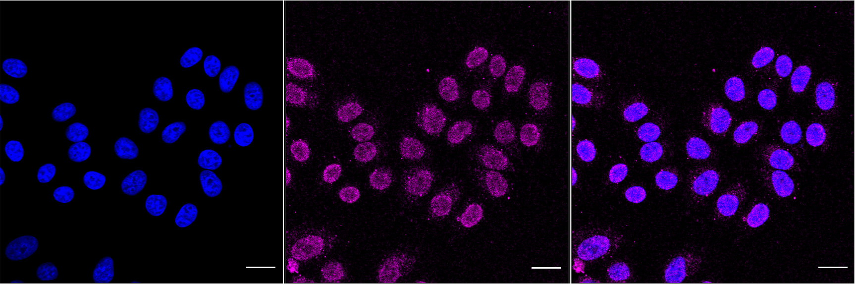 Immunocytochemical staining of HepG2 cells with Pyruvate Dehydrogenase E2 antibody. Nuclei were stained blue with DAPI; Pyruvate Dehydrogenase E2 was stained magenta with Alexa Fluor? 647. Images were taken using Leica stellaris 5. Protein abundance based on laser Intensity and smart gain: Low. Scale bar, 20 μm.