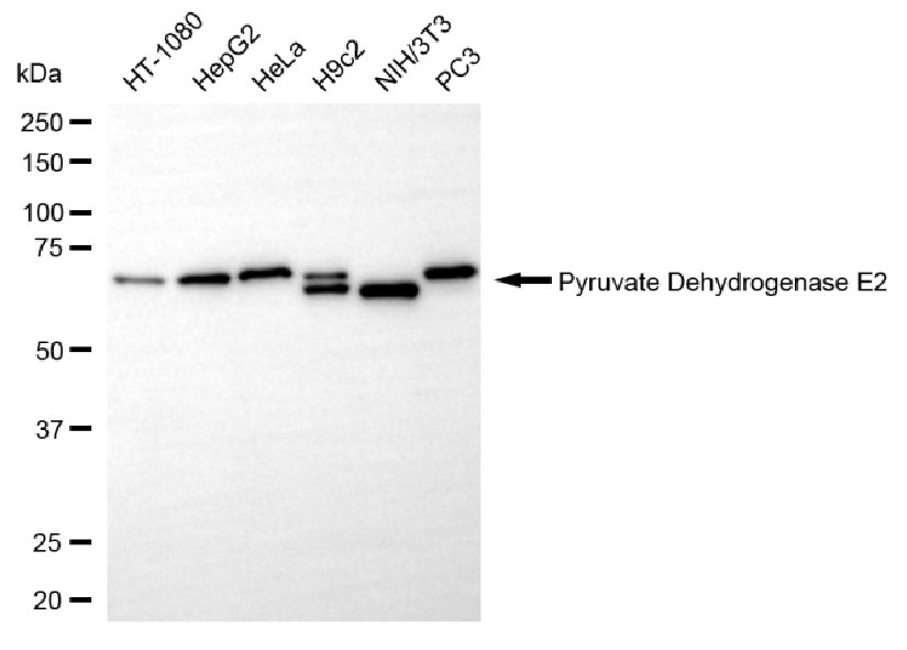 Western blotting analysis using pyruvate dehydrogenase E2 antibody. Total cell lysates (30 μg) from various cell lines were loaded and separated by SDS-PAGE. The blot was incubated with pyruvate dehydrogenase E2 antibody and HRP-conjugated goat anti-rabbit secondary antibody respectively.