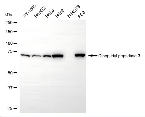 Western blotting analysis using dipeptidyl peptidase 3 antibody. Total cell lysates (30 μg) from various cell lines were loaded and separated by SDS-PAGE. The blot was incubated with dipeptidyl peptidase 3 antibody and HRP-conjugated goat anti-rabbit secondary antibody respectively.