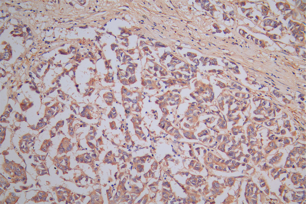 IHC image of CSB-RA614975MA1HU diluted at 1:150 and staining in paraffin-embedded human breast cancer performed on a Leica BondTM system. After dewaxing and hydration, antigen retrieval was mediated by high pressure in a citrate buffer (pH 6.0). Section was blocked with 10% normal goat serum 30min at RT. Then primary antibody (1% BSA) was incubated at 4°C overnight. The primary is detected by a Goat anti-Rabbit IgG labeled by HRP and visualized using 0.05% DAB.