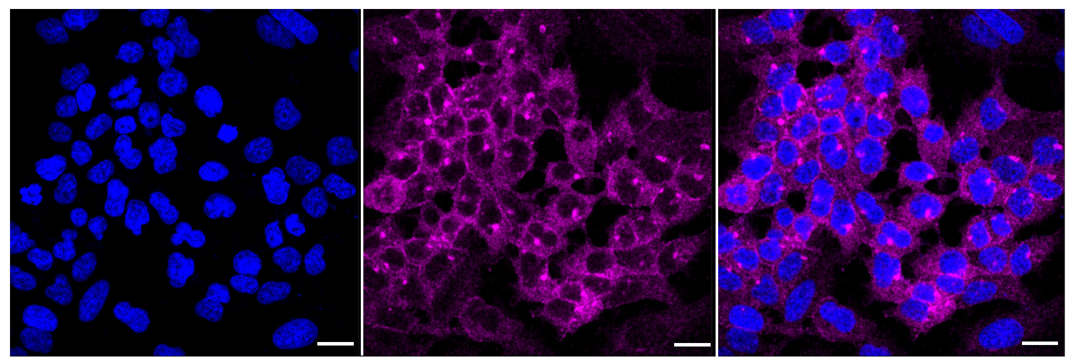 Immunocytochemical staining of Hela cells with Desmocollin 3 antibody. Nuclei were stained blue with DAPI; Desmocollin 3 with Alexa Fluor? 647. Images were taken using Leica stellaris 5. Protein abundance based on laser Intensity and smart gain: Medium. Scale bar: 20 μm.