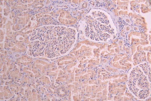 IHC image of CSB-RA440534A0HU diluted at 1:100 and staining in paraffin-embedded human kidney tissue performed on a Leica BondTM system. After dewaxing and hydration, antigen retrieval was mediated by high pressure in a citrate buffer (pH 6.0). Section was blocked with 10% normal goat serum 30min at RT. Then primary antibody (1% BSA) was incubated at 4°C overnight. The primary is detected by a Goat anti-rabbit polymer IgG labeled by HRP and visualized using 0.05% DAB.