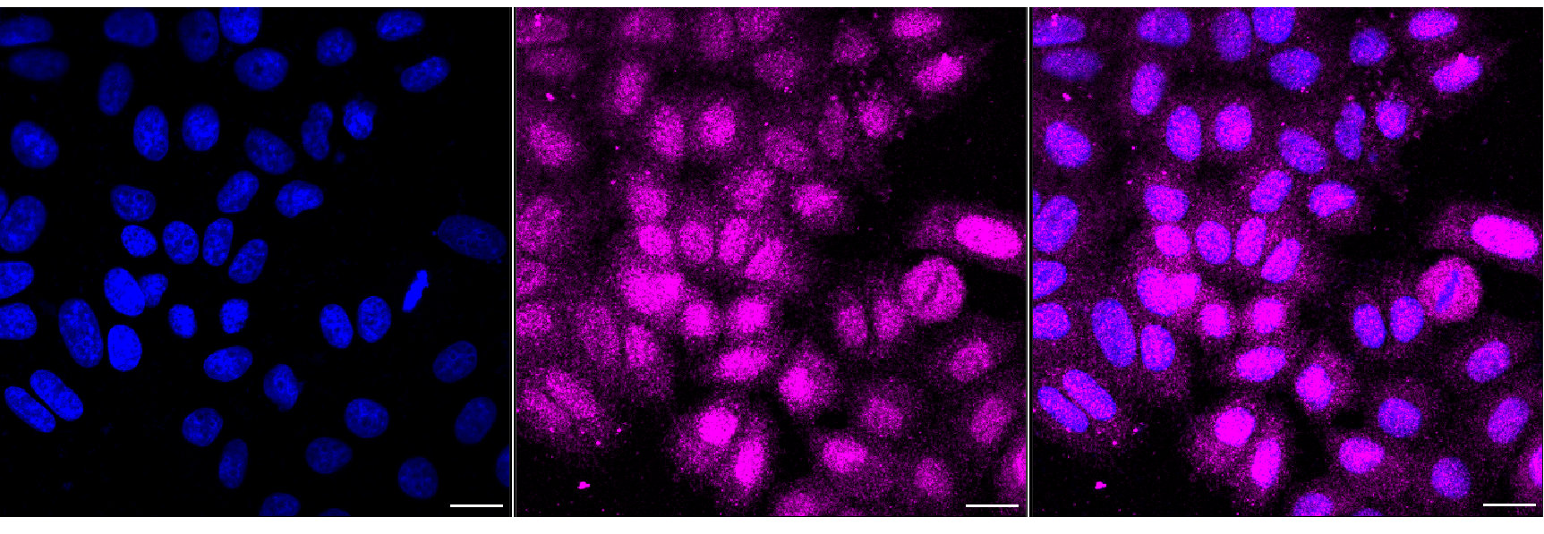Immunocytochemical staining of HepG2 cells with DYNLL1 antibody. Nuclei were stained blue with DAPI; DYNLL1 was stained magenta with Alexa Fluor? 647. Images were taken using Leica stellaris 5. Protein abundance based on laser Intensity and smart gain: Medium. Scale bar, 20 μm.
