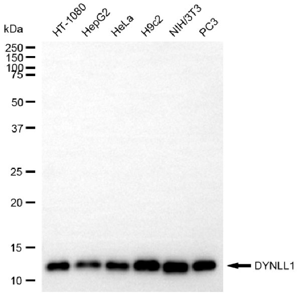 Western blotting analysis using DYNLL1 antibody. Total cell lysates (30 μg) from various cell lines were loaded and separated by SDS-PAGE. The blot was incubated with DYNLL1 antibody and HRP-conjugated goat anti-rabbit secondary antibody respectively.