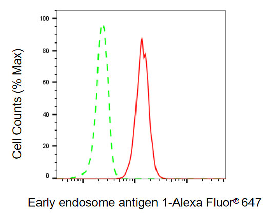 Flow cytometric analysis of early endosome antigen 1 expression in HT-1080 cells using early endosome antigen 1 antibody. Green, isotype control; red, early endosome antigen 1.