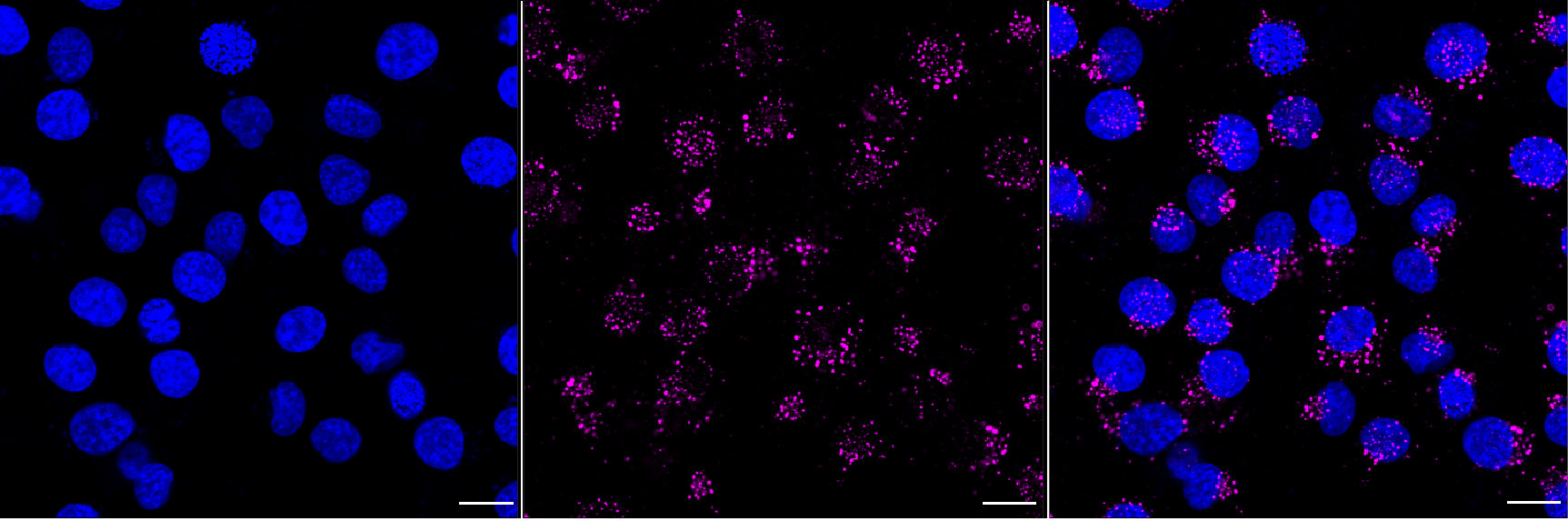 Immunocytochemical staining of HT-1080 cells with early endosome antigen 1 antibody. Nuclei were stained blue with DAPI; Early endosome antigen 1 was stained magenta with Alexa Fluor? 647. Images were taken using Leica stellaris 5. Protein abundance based on laser Intensity and smart gain: Medium. Scale bar, 20 μm.
