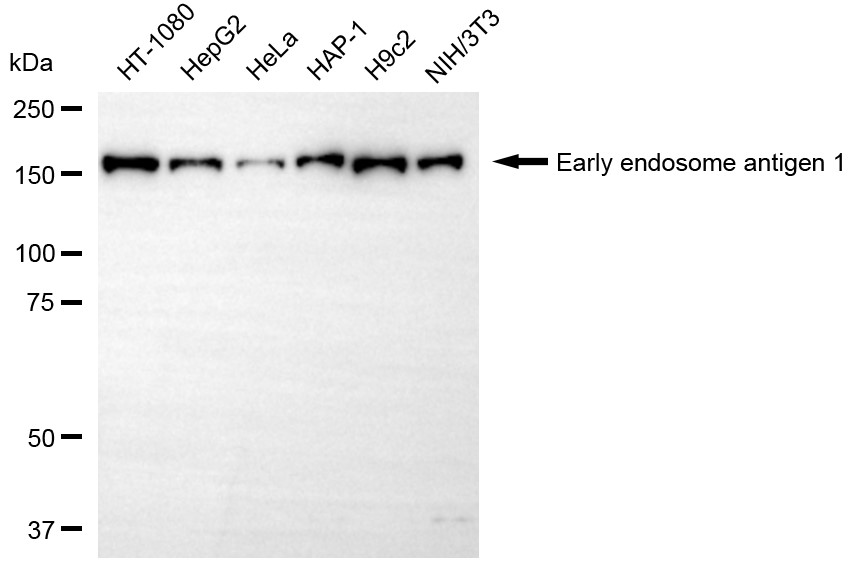 Western blotting analysis using early endosome antigen 1 antibody. Total cell lysates (30 μg) from various cell lines were loaded and separated by SDS-PAGE. The blot was incubated with early endosome antigen 1 antibody and HRP-conjugated goat anti-rabbit secondary antibody respectively.
