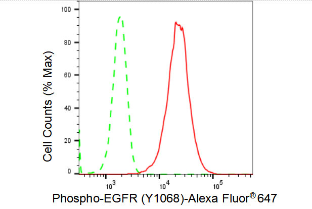 Flow cytometric analysis of Phospho-EGFR (Y1068) expression in HepG2 cells using Phospho-EGFR (Y1068) antibody. Green, isotype control; red, Phospho-EGFR (Y1068).