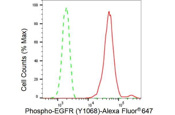 Flow cytometric analysis of Phospho-EGFR (Y1068) expression in HepG2 cells using Phospho-EGFR (Y1068) antibody. Green, isotype control; red, Phospho-EGFR (Y1068).