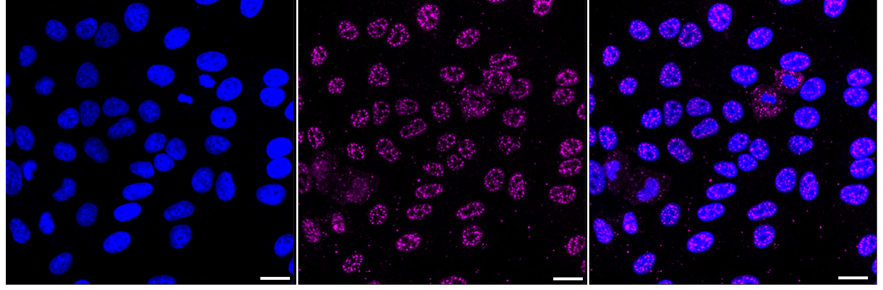Immunocytochemical staining of HepG2 cells with Phospho-EGFR (Y1068) antibody. Nuclei were stained blue with DAPI; Phospho-EGFR (Y1068) was stained magenta with Alexa Fluor? 647. Images were taken using Leica stellaris 5. Protein abundance based on laser Intensity and smart gain: Medium. Scale bar: 20 μm.